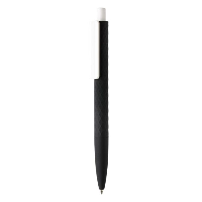 Soft touch (rubberized finish) plastic pen with geometric design. Blue ink.