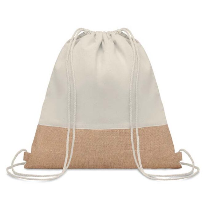 Drawstring Bag made from GRS-certified 140GSM recycled cotton and jute combination material. Comes with a white drawstring rope.