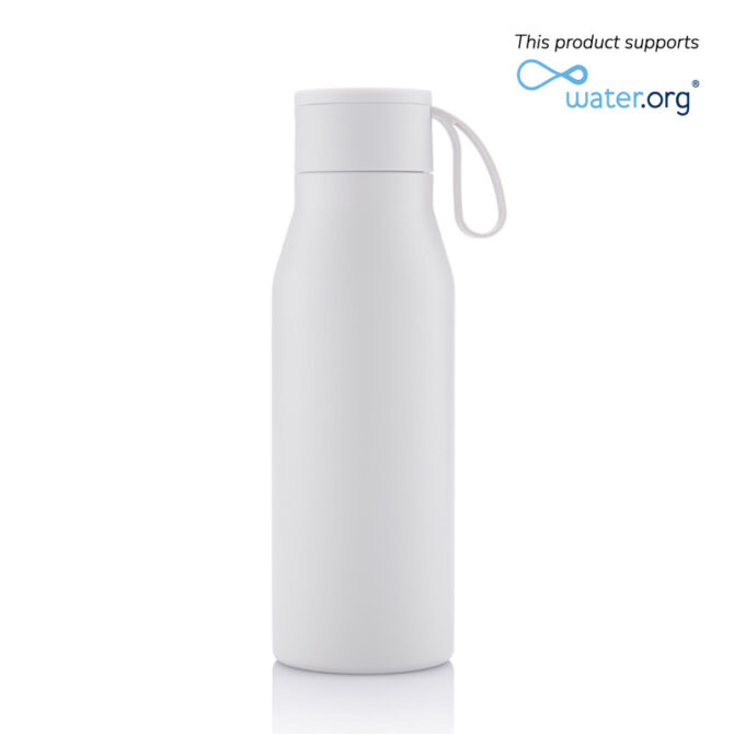 Hans LarsenĀ® Nebra Vacuum Insulated Water Bottle is part of the CHANGE Collection, and as a result, contributes to Water.org – a global NGO that provides millions with access to safe water and sanitation. By giving to Water.org, you are giving a GIFT THAT GIVES BACK. Nebra is double walled, leakproof, has a carry loop, stainless steel reusable water bottle with 8 hours hot, and 24 hours cold storage. Scandinavian design. Content: 600ml