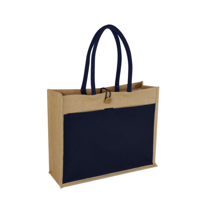 Jute bag with button and black cotton pocket and handle