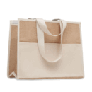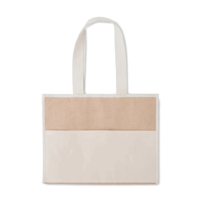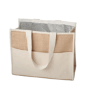 Jute with Inner Foil Lining is a cooler bag with velcro closure, front pocket and long cotton webbing handles.